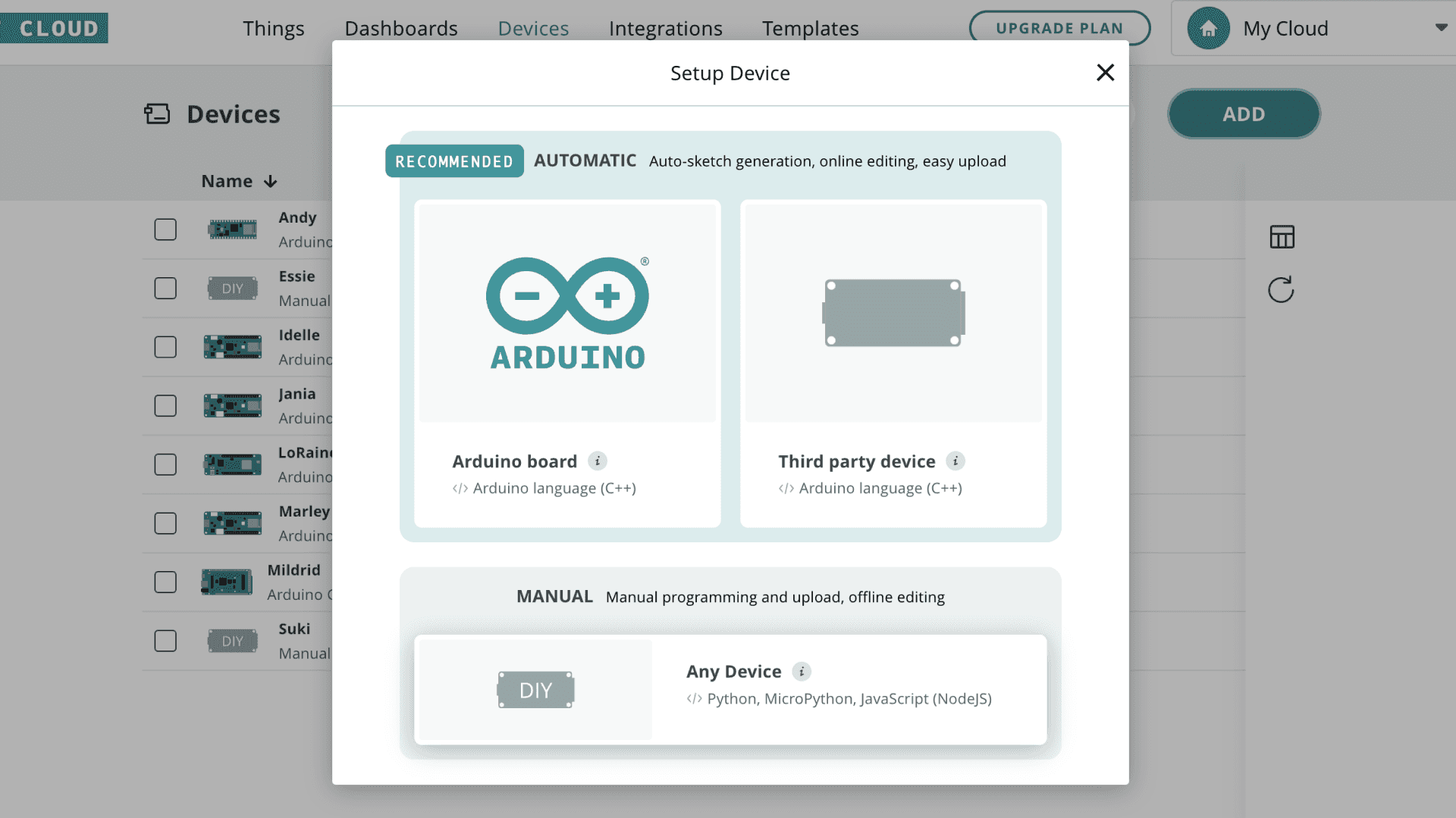 To configure a manual device, go to devices in the Arduino Cloud, and click the "Add" button. This will open a new window, where you will be asked to either configure automatically, or manually. Choose the "Manual" option.