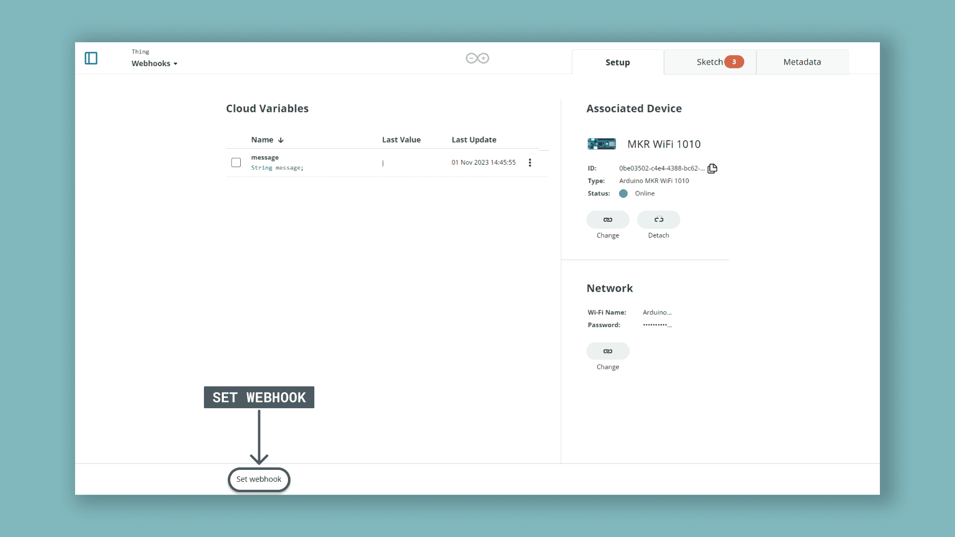 A webhook can be set for any Thing on the Arduino Cloud, allowing us to send data from the Arduino Cloud to various third party platforms. For example, you can use webhooks to receive an email when any of you devices is disconnected, or send and save live sensor values collected from your device in a Google Spreadsheet.