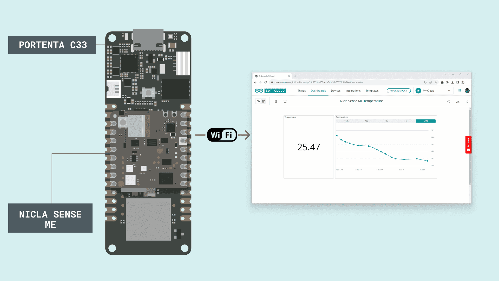 In this example, a Portenta C33 will be used as a gateway to forward Nicla Sense ME sensors data to the Arduino IoT Cloud.
